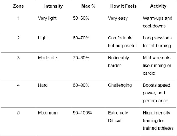 Zone 1: Warm-up (50–60%) - light activity and recovery